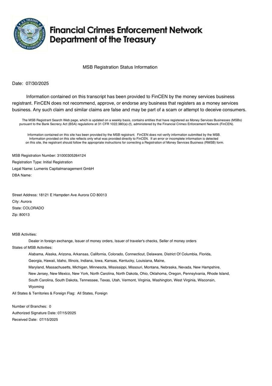 Ein wesentliches Element der Unternehmensstabilität ist die regulatorische Absicherung. Die Lumenis Capitalmanagement GmbH ist unter der Lizenznummer 31000305264124 als Money Services Business (MSB) bei der Financial Crimes Enforcement Network (FinCEN) des US-Finanzministeriums registriert. Diese Registrierung verpflichtet zur Einhaltung strenger Compliance-, Transparenz- und Kontrollstandards im internationalen Finanzgeschäft.